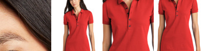 100% polyester wicking smooth knit * Wicks Moisture * Odor resistant * Ladies' fit * Tag-free label * V-neck collar * Contrast color collar and princess seams * Set-in cap sleeves